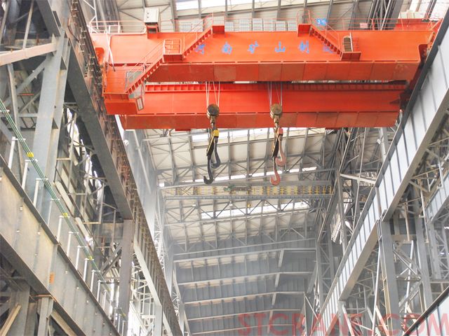 双小车桥式起重机与吊钩桥式起重机的区别在于主梁上设置两台小车,双小车可以单独起升,也可单独运行;当需要抬吊长件物品时,通过控制台上的转换开关,实现同步起升,同步运行。
